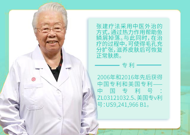 張建療法采用中醫(yī)外治的方式,通過熱力作用幫助魚鱗屑掉落。與此同時,在治療的過程中,可使得毛孔充分?jǐn)U張,滋養(yǎng)皮膚后可恢復(fù)正常膚質(zhì) 在2006年和2016年先后獲得中國專利和美國專利 中國專利號:ZL03121032.5、美國專利號:US9,241,966 B1。